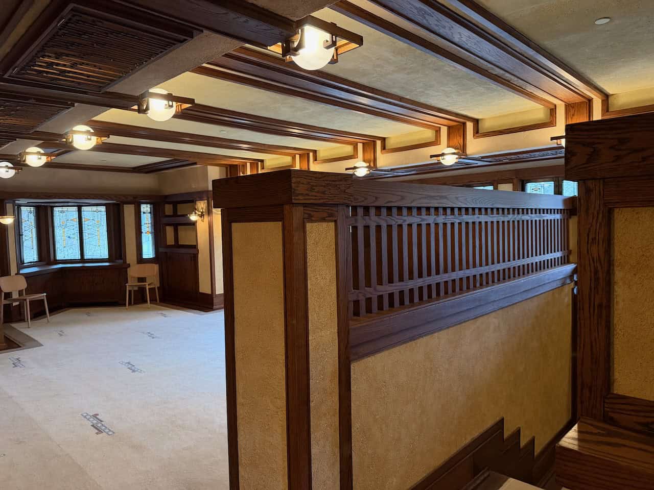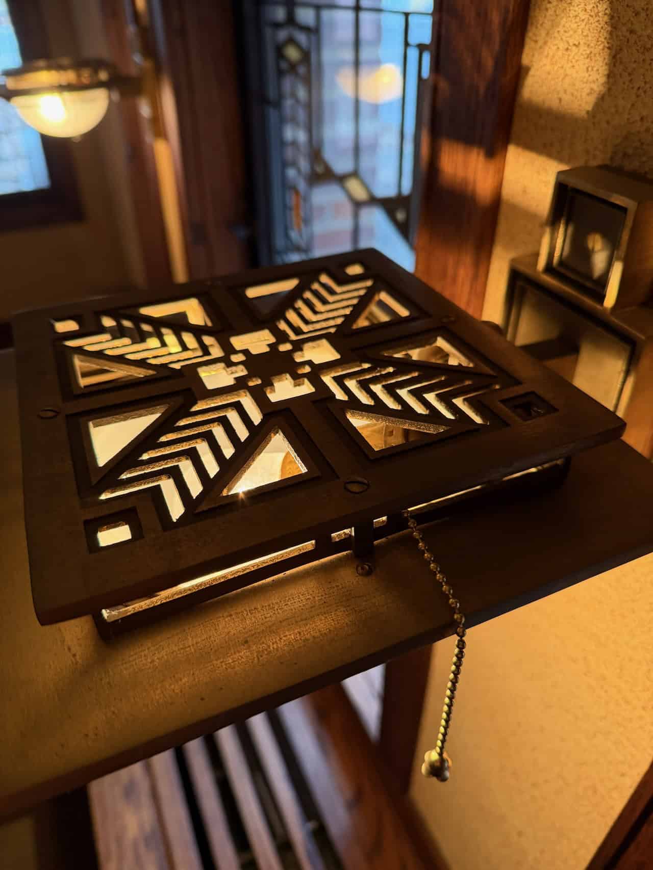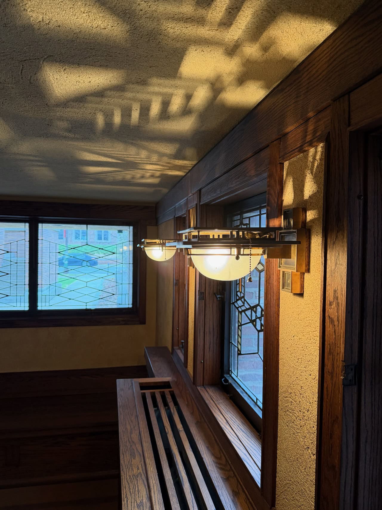 Beautiful light fittings, designed by Wright with his trademark circle and square.... used in many of his houses, but the pierced metal panels which make amazing shadows on the ceiling were then custom-designed for each individual house.
