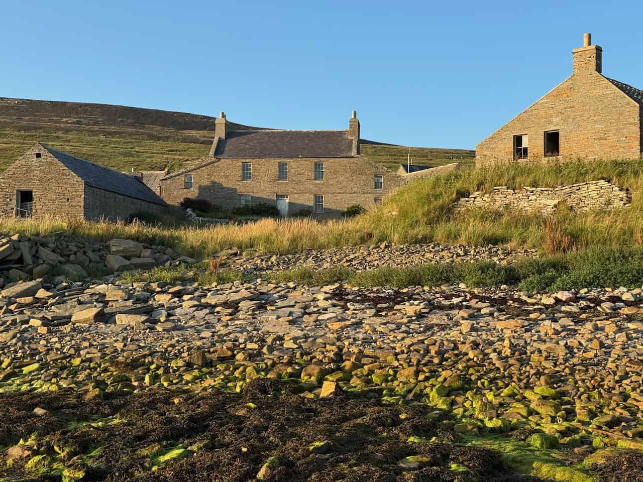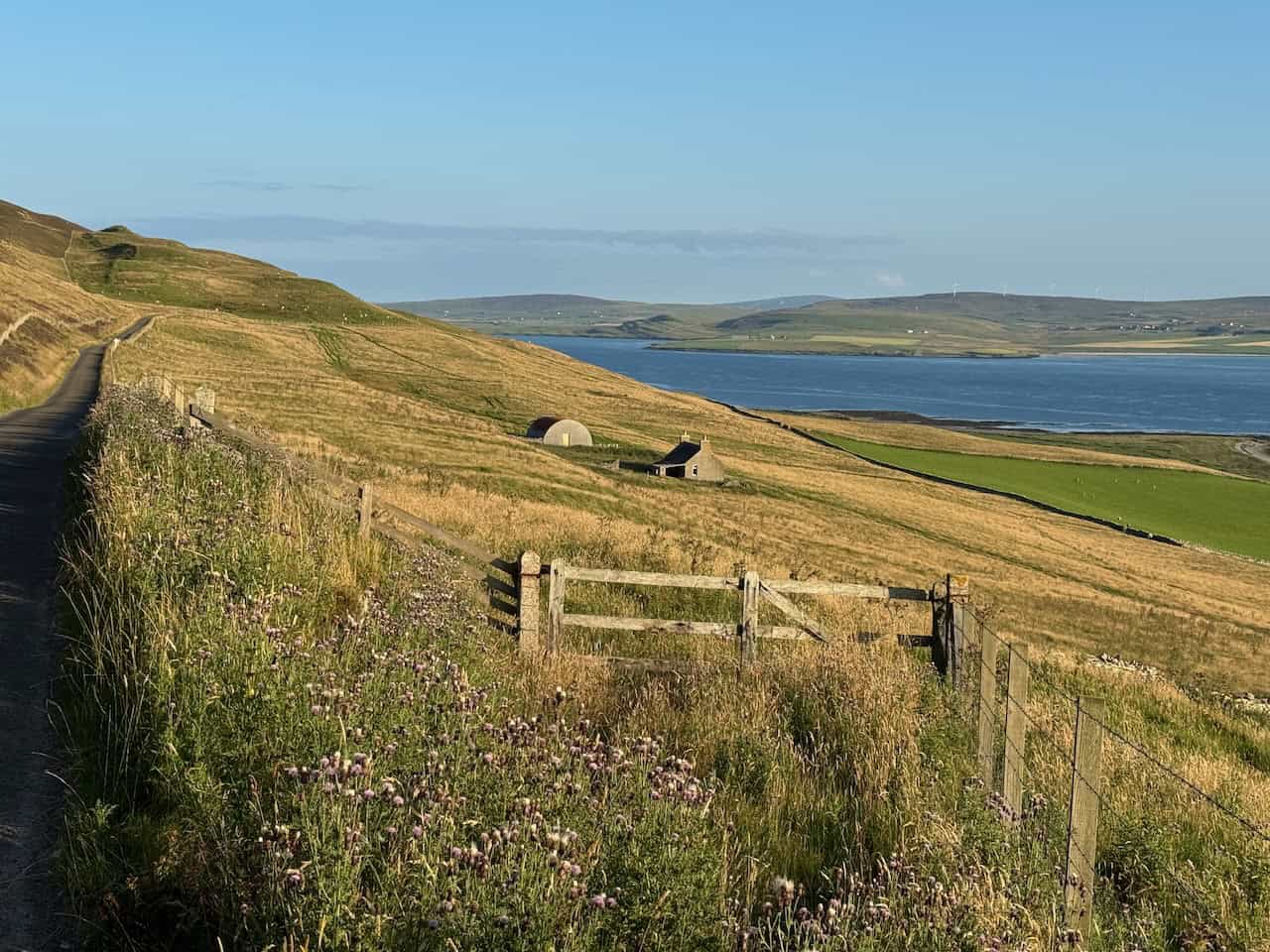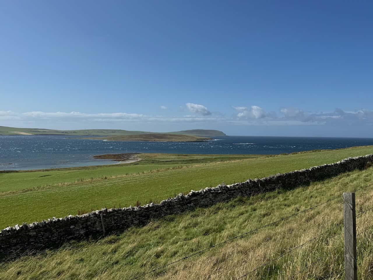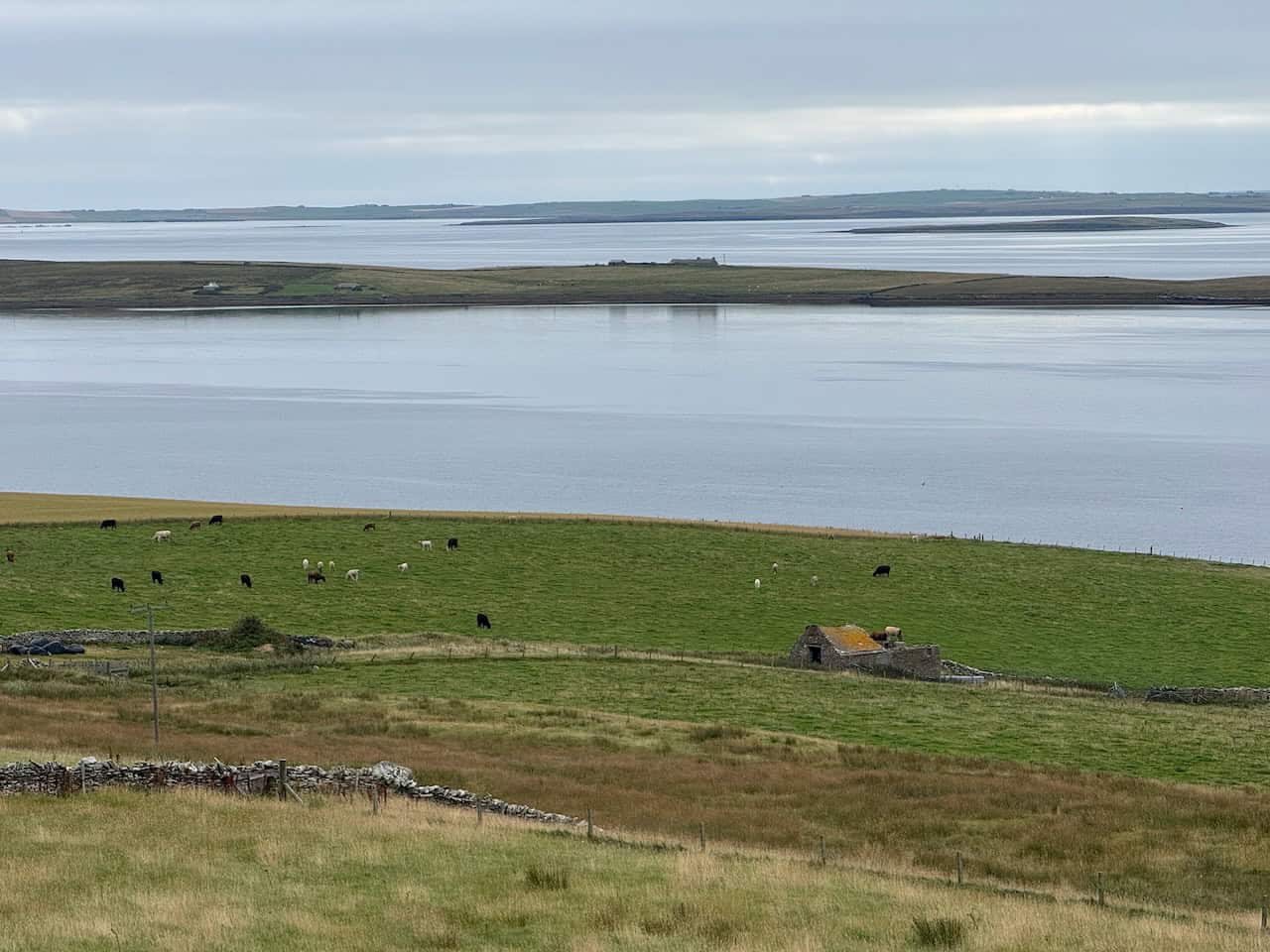 Home to Westness. Here's the farm next door with a serene sea on our walk that afternoon.