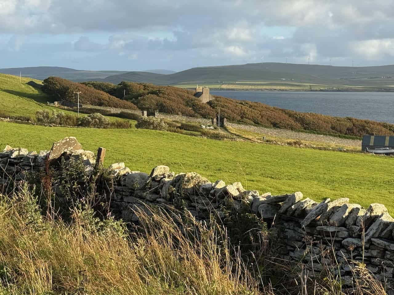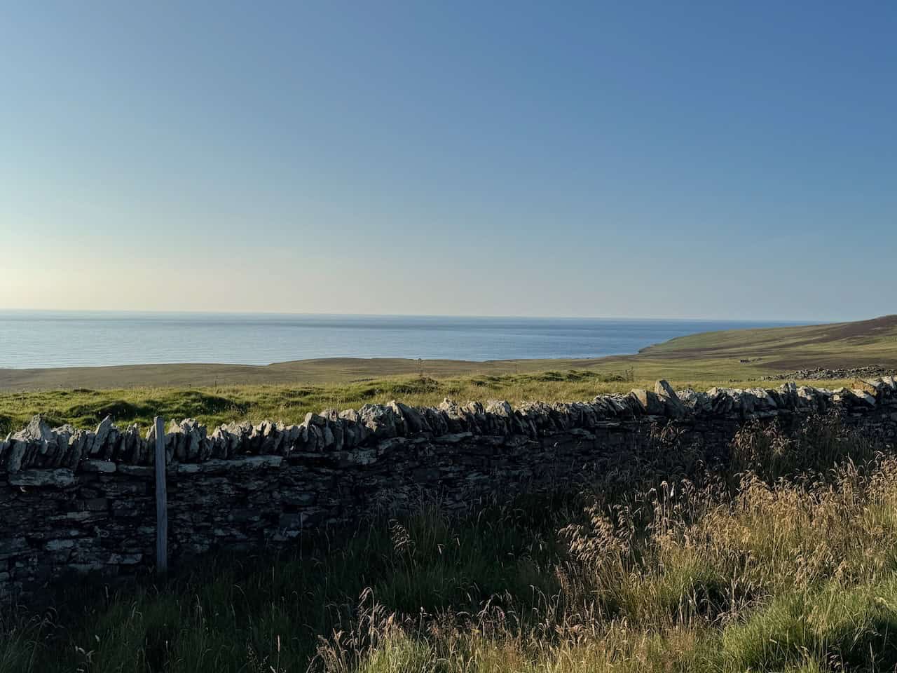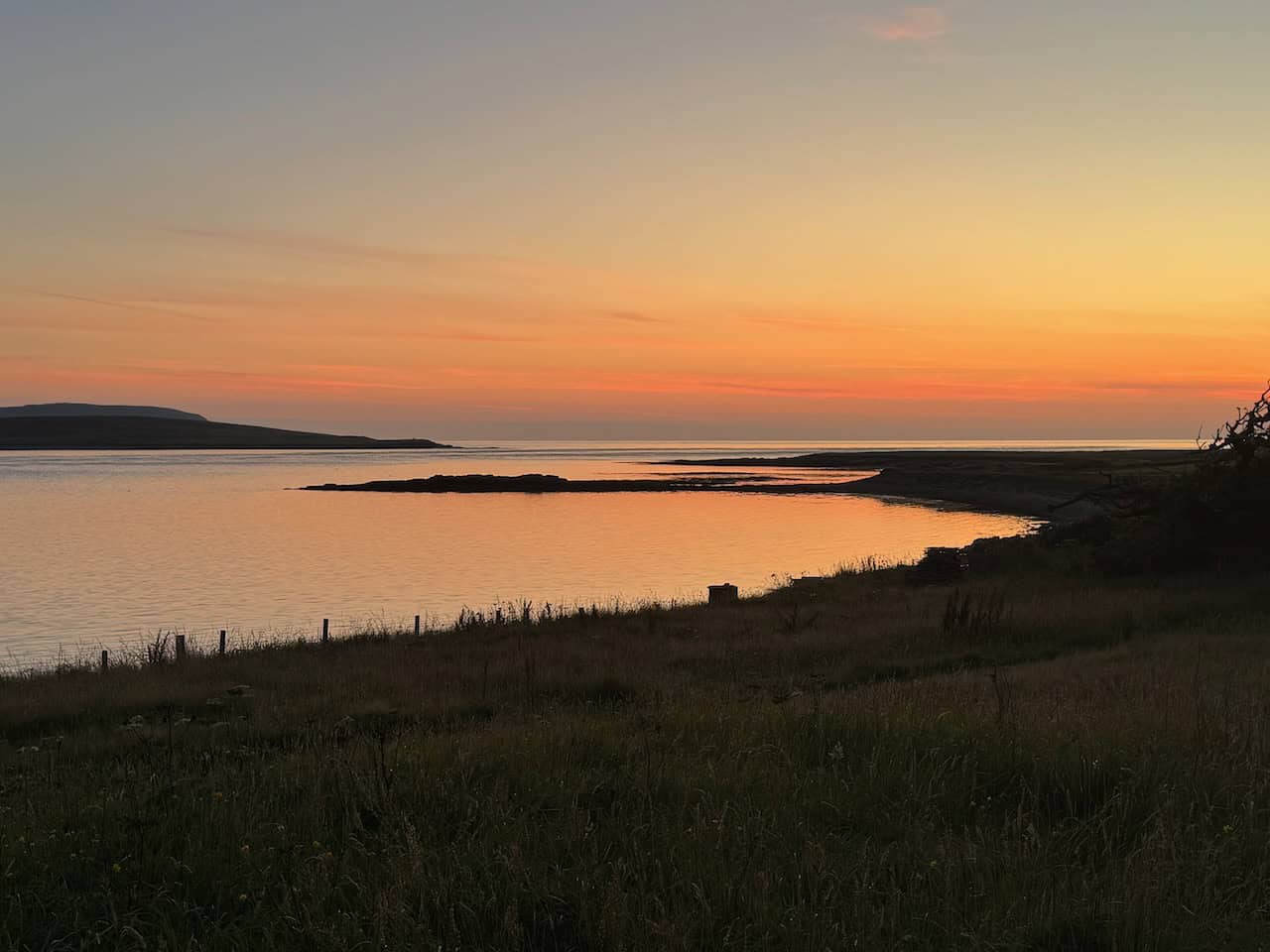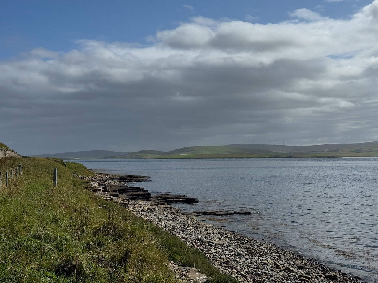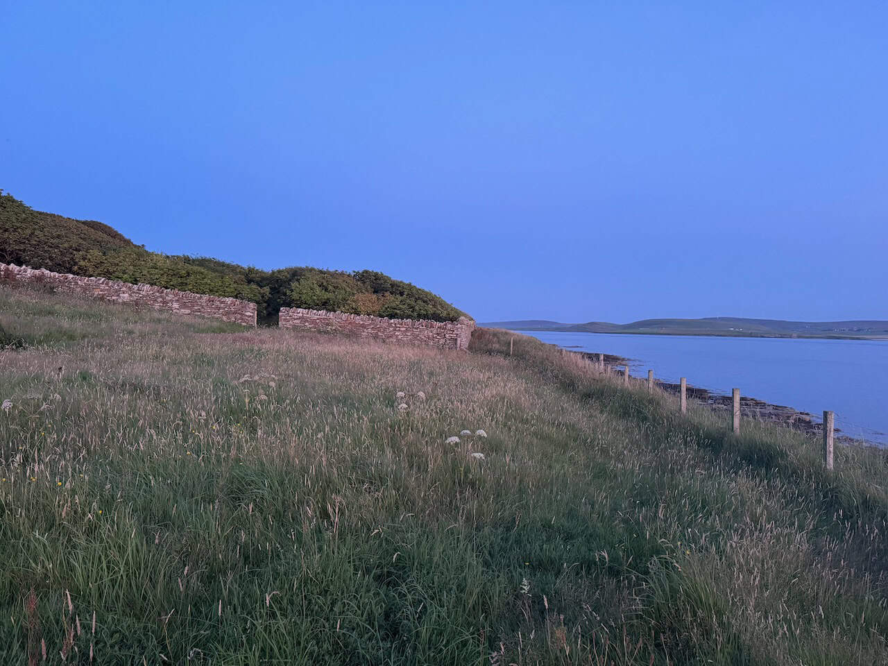Home to Westness. Here's the farm next door with a serene sea on our walk that afternoon.