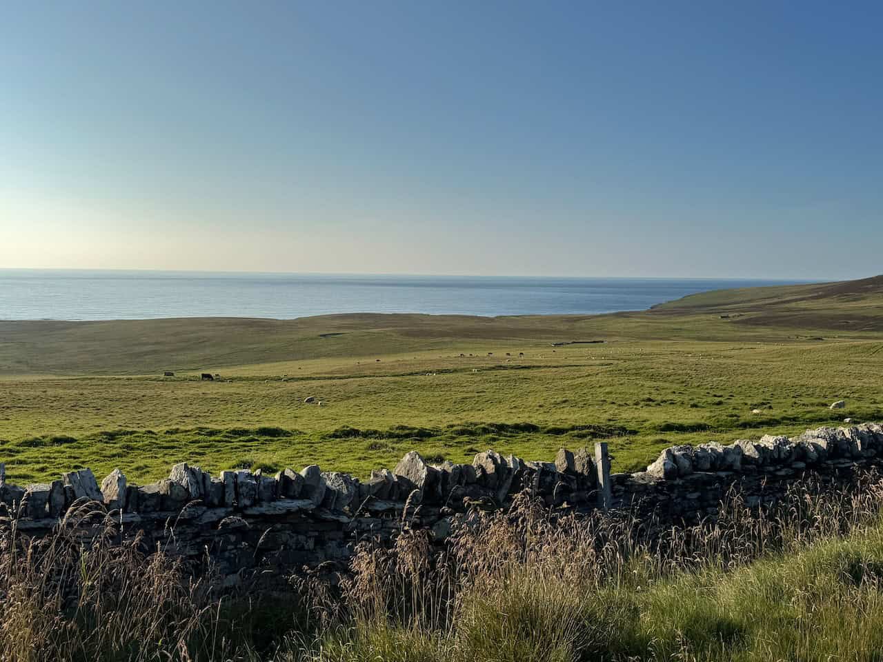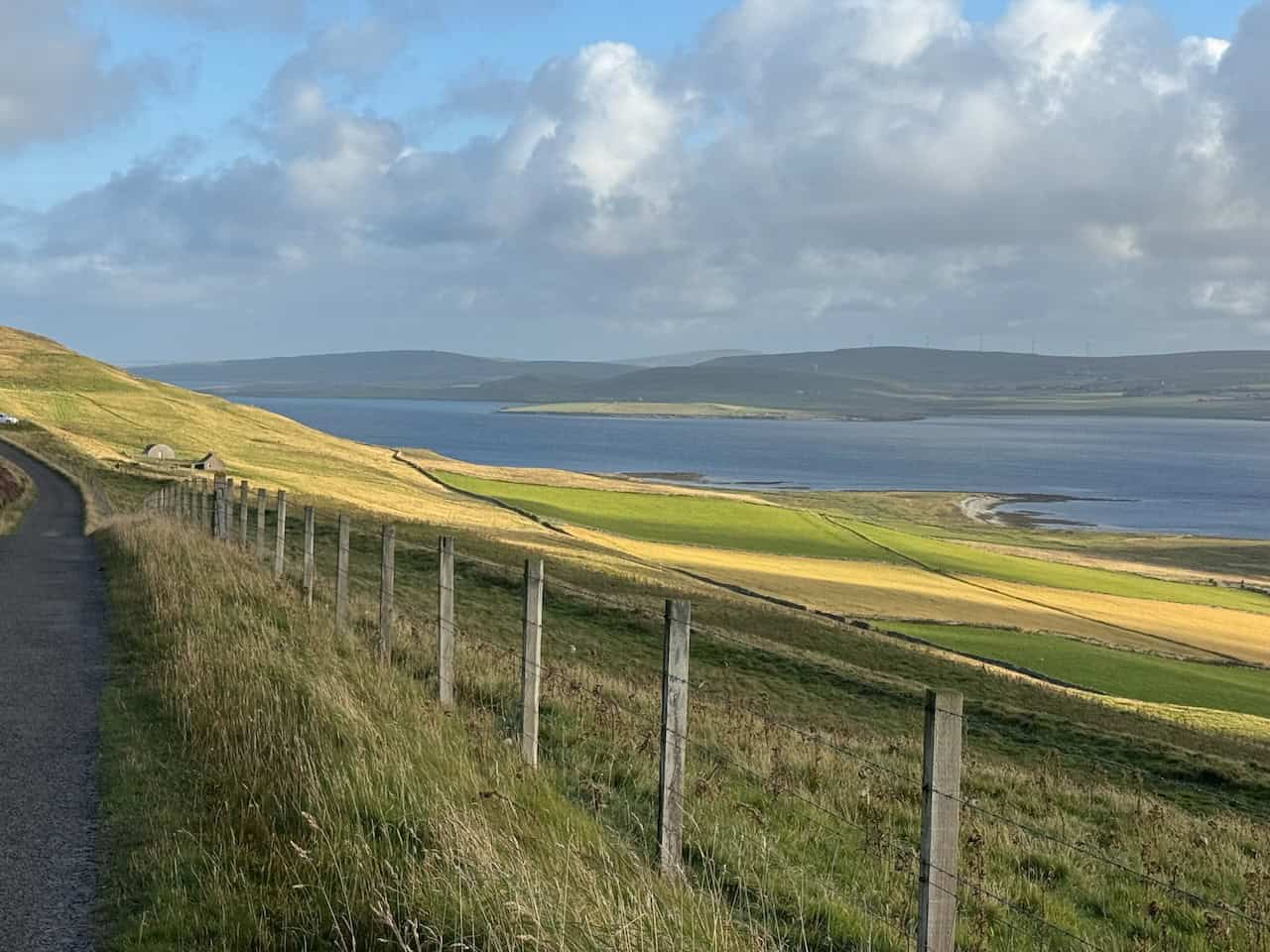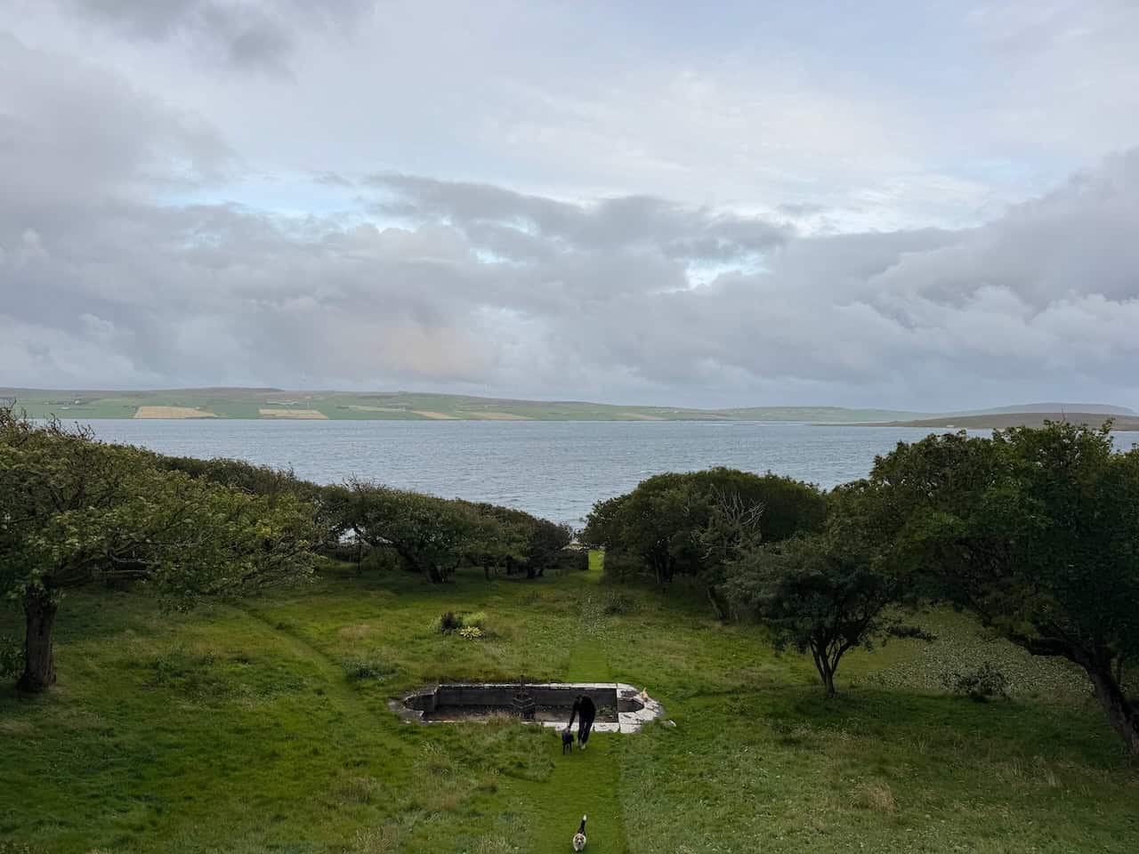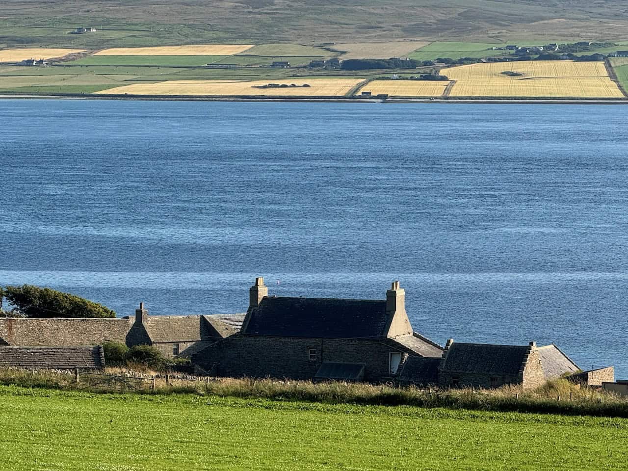 Home to Westness. Here's the farm next door with a serene sea on our walk that afternoon.