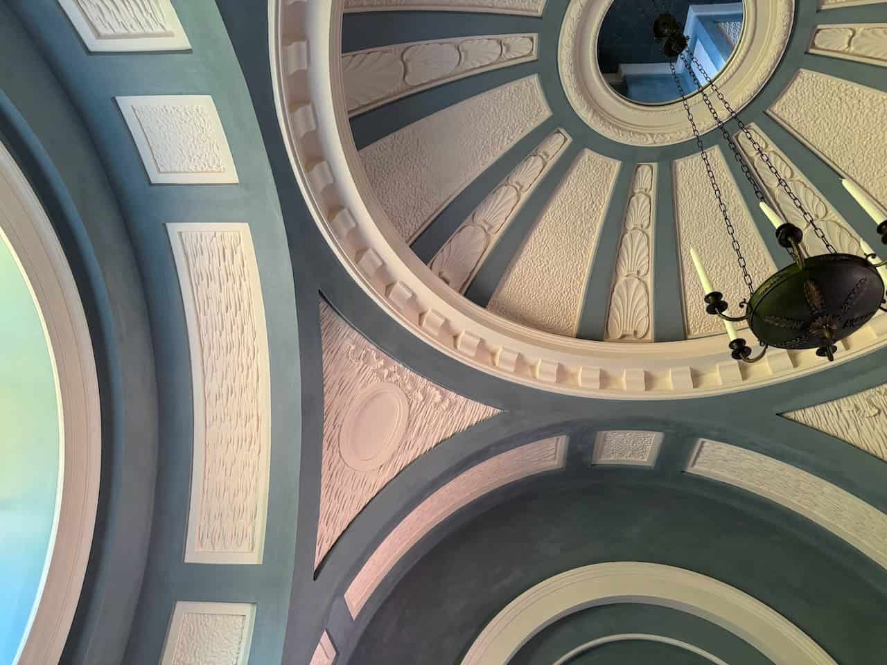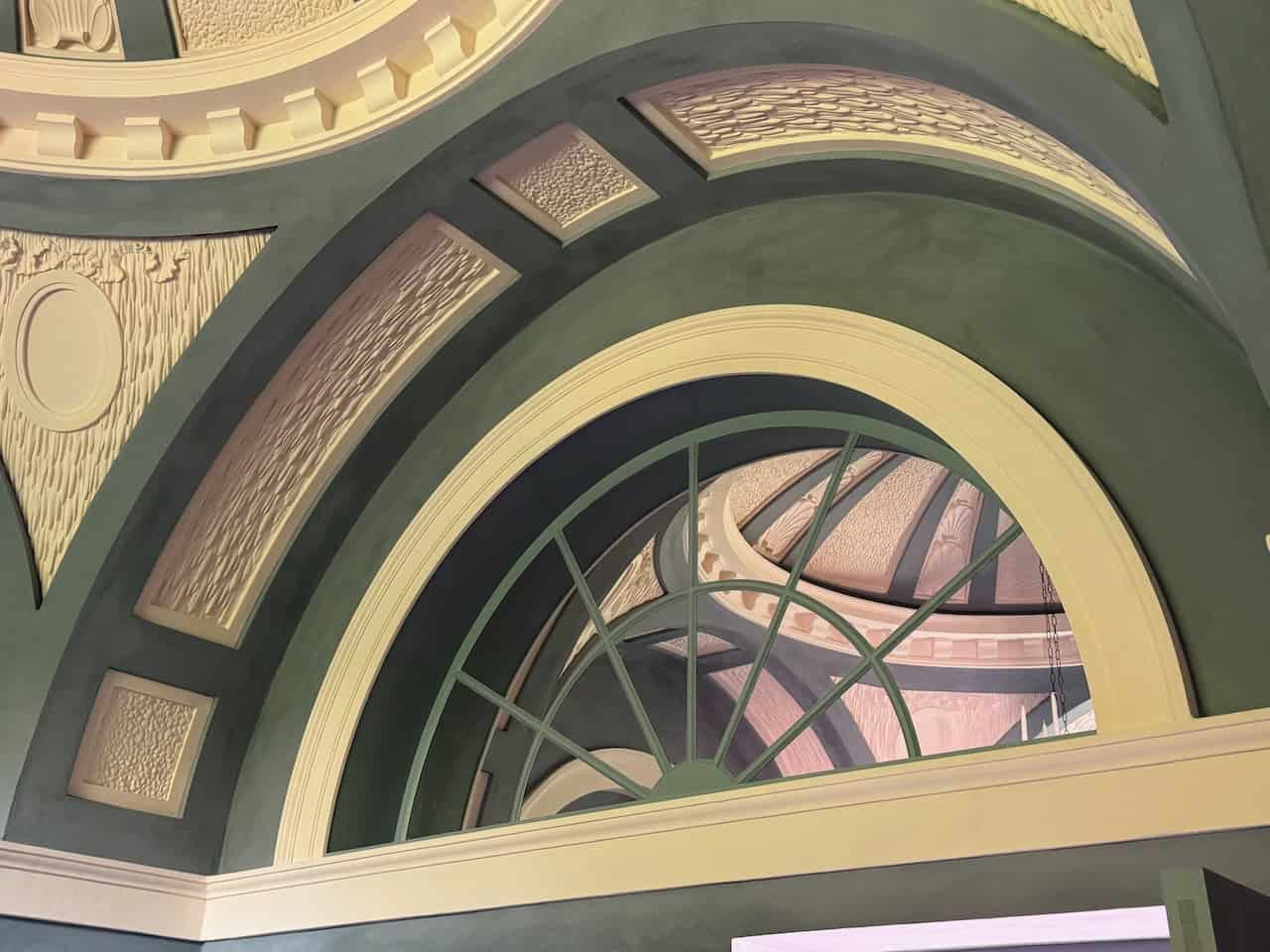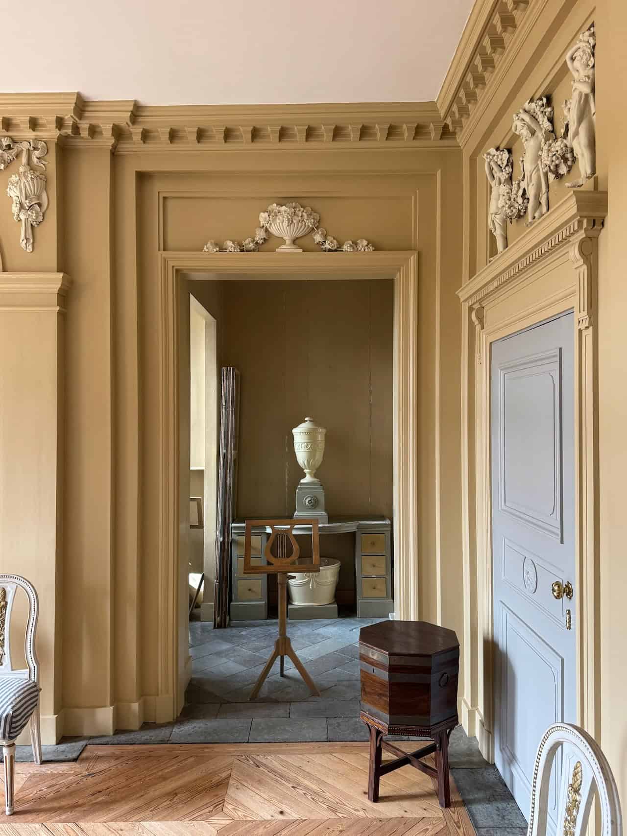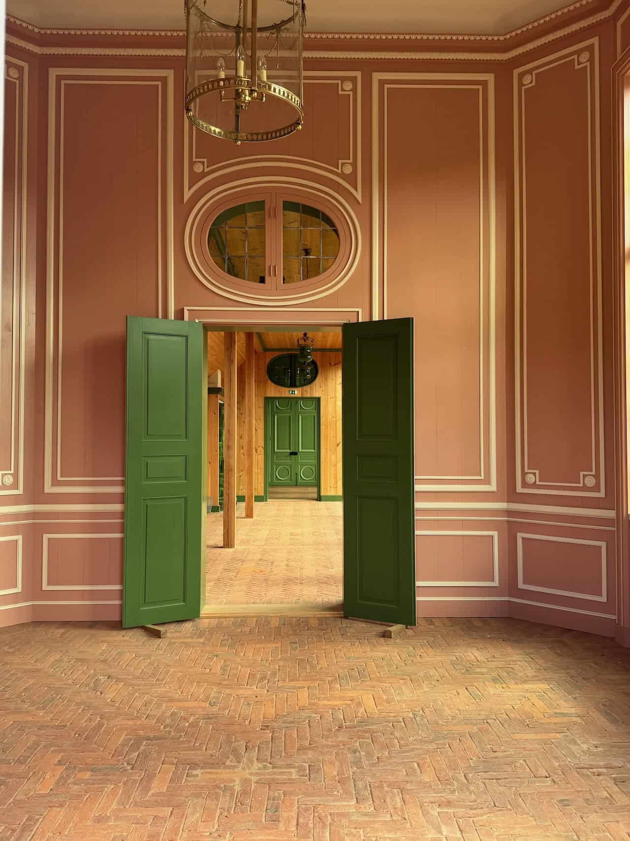 The plaster grotto is in the left hand end of the the pavilion. The right hand door leads to the pink panelled room which is the foyer to the glasshouse.
