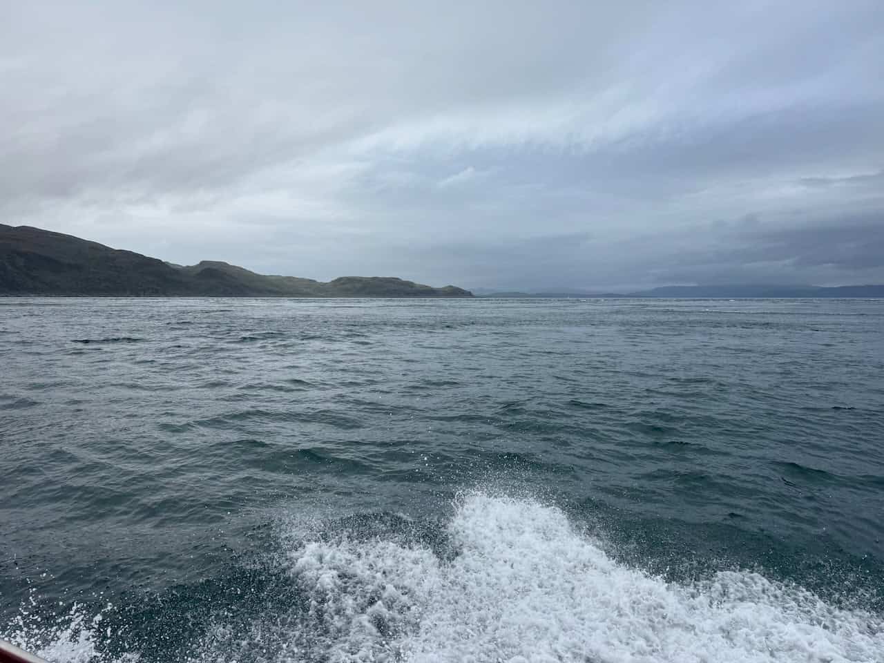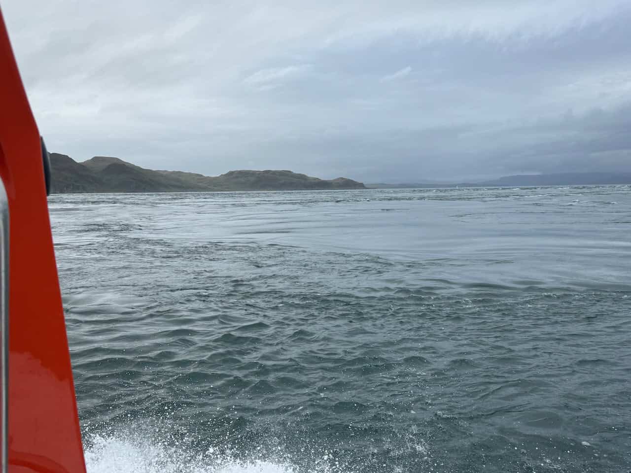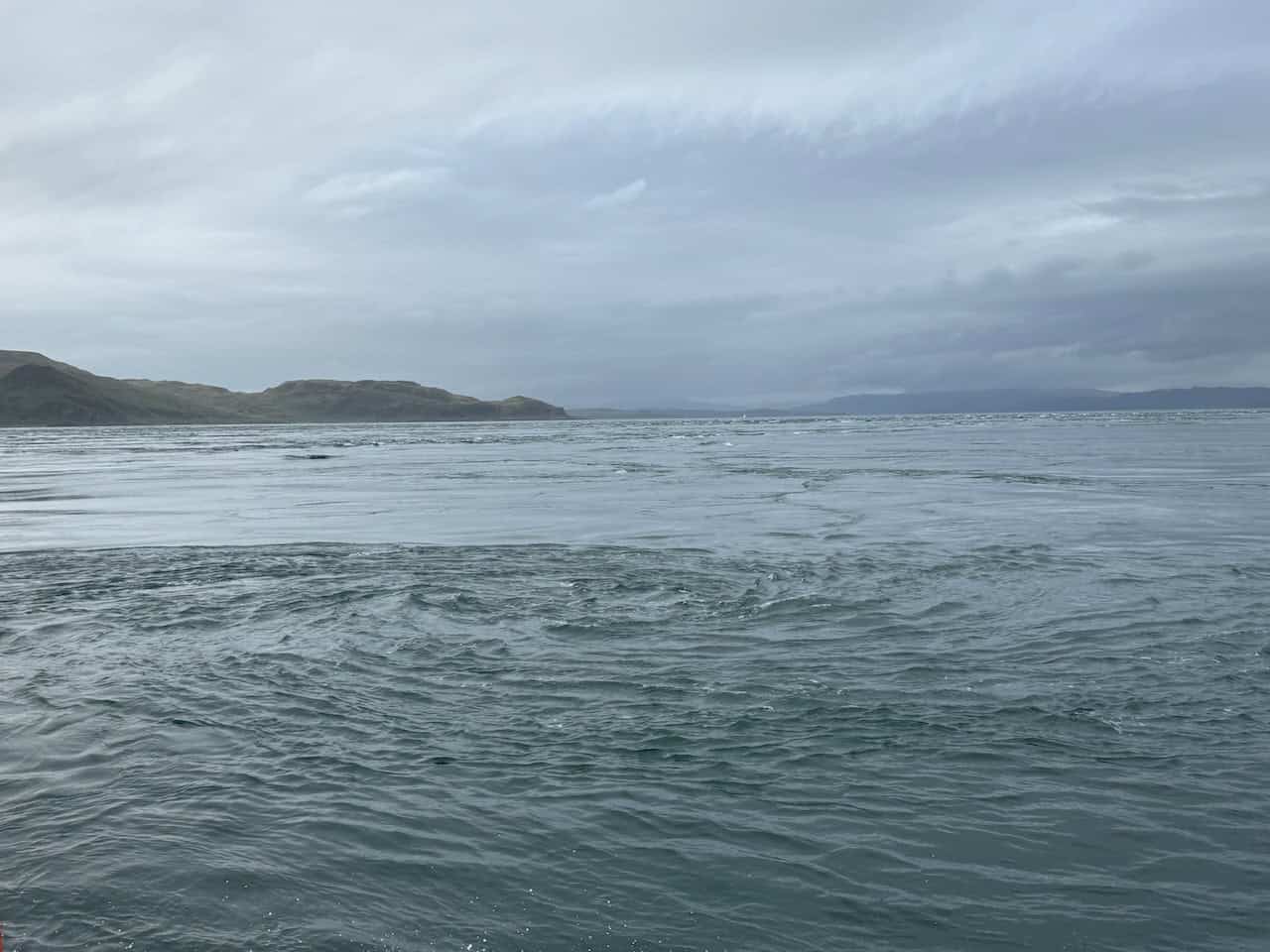 As you approach the waters of the Gulf of Corryvreckan, the sea goes very strange. We've never crossed the Corryvreckan at the precise time and tide when the full whirlpool is raging, but the water is filled with mini whirlpools and areas that are eerily flat calm.