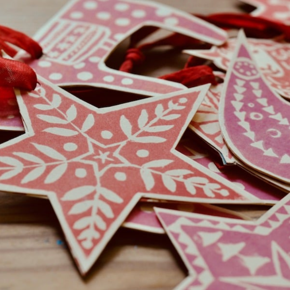 These naive folk-art Christmas decorations are of 600gsm smooth ivory uncoated duplexed card, printed on both sides in hand-mixed colours. Supplied as a sheet 297 x 420 mm, the decorations can be popped out from the sheet and strung with the thread, ribbon, yarn or string of your choice. Can be hung singly or strung as a garland.