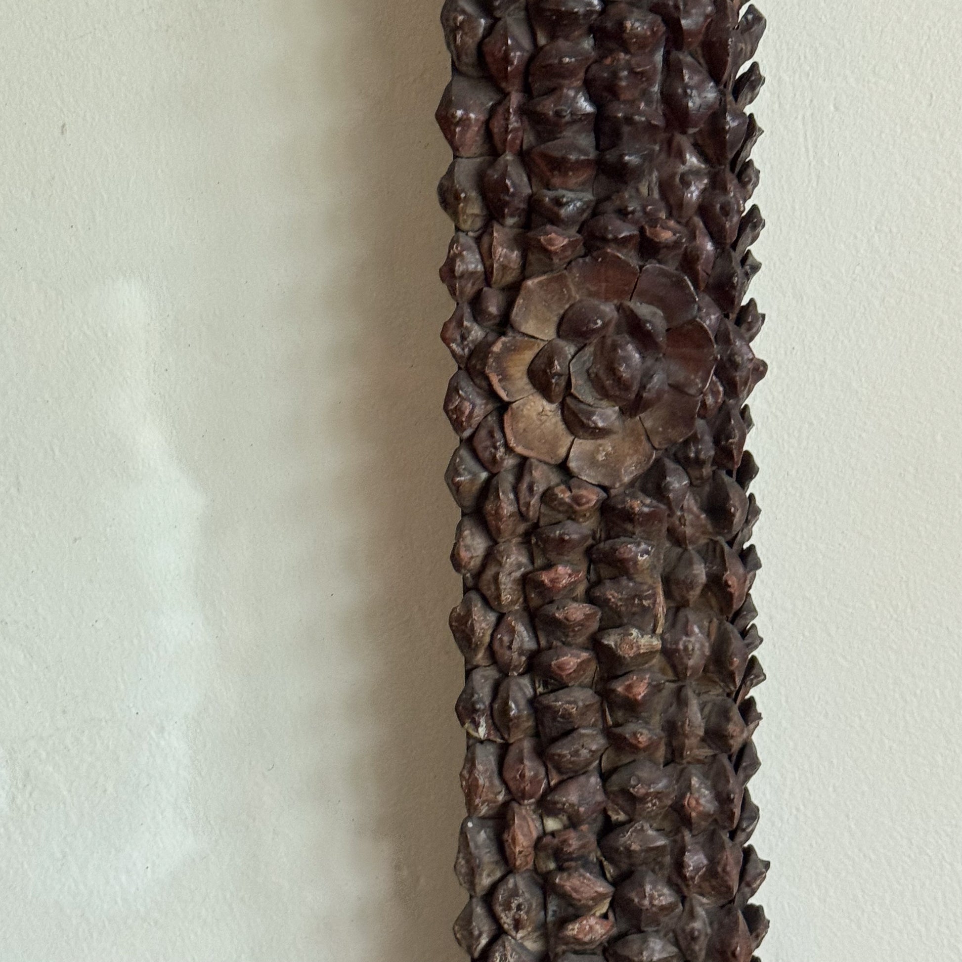 Rectangular pine frames covered with pine cone decoration. With a shaped crest a roundel.