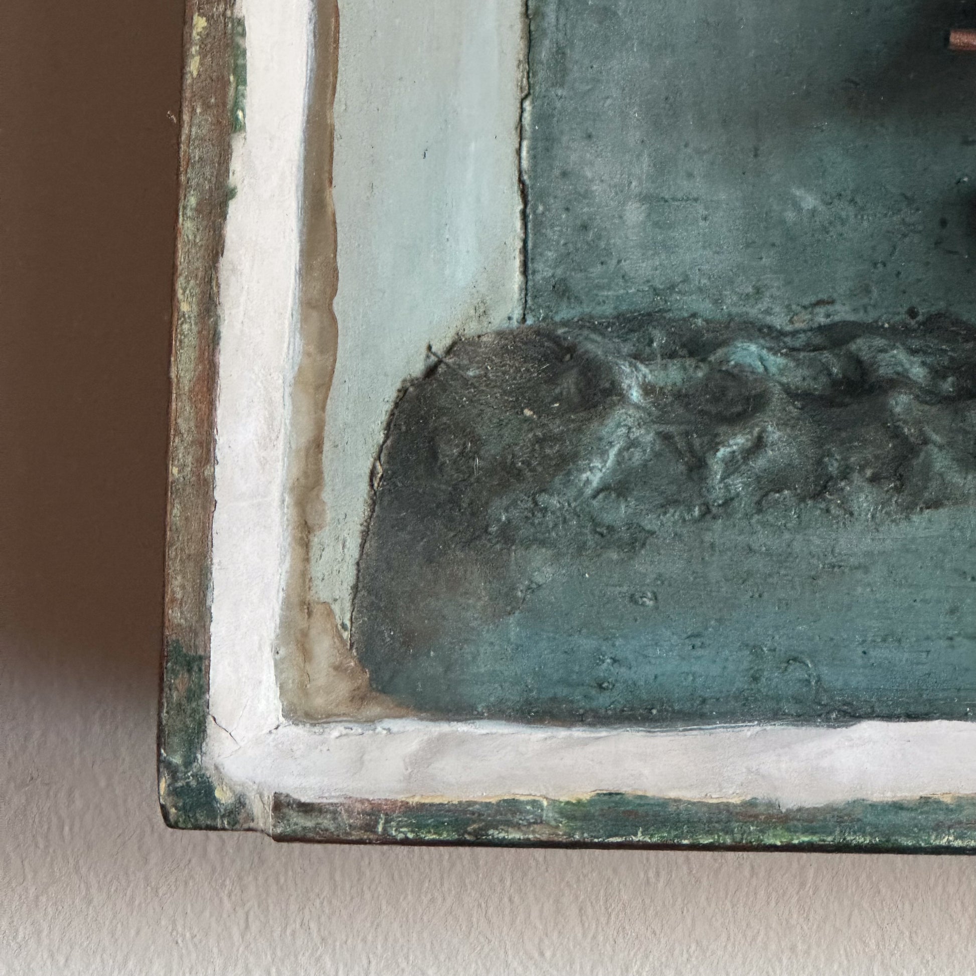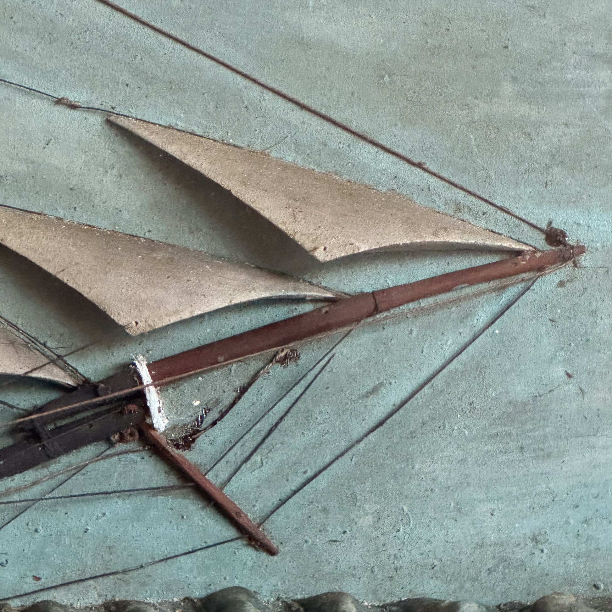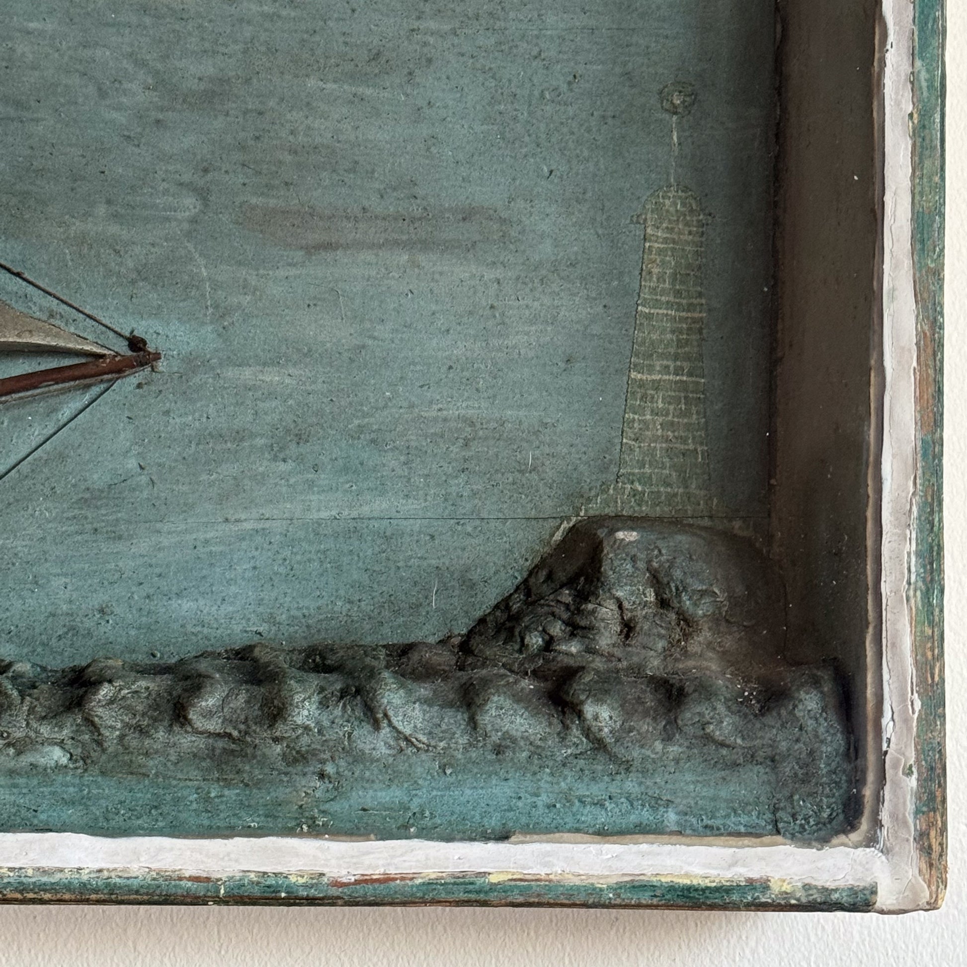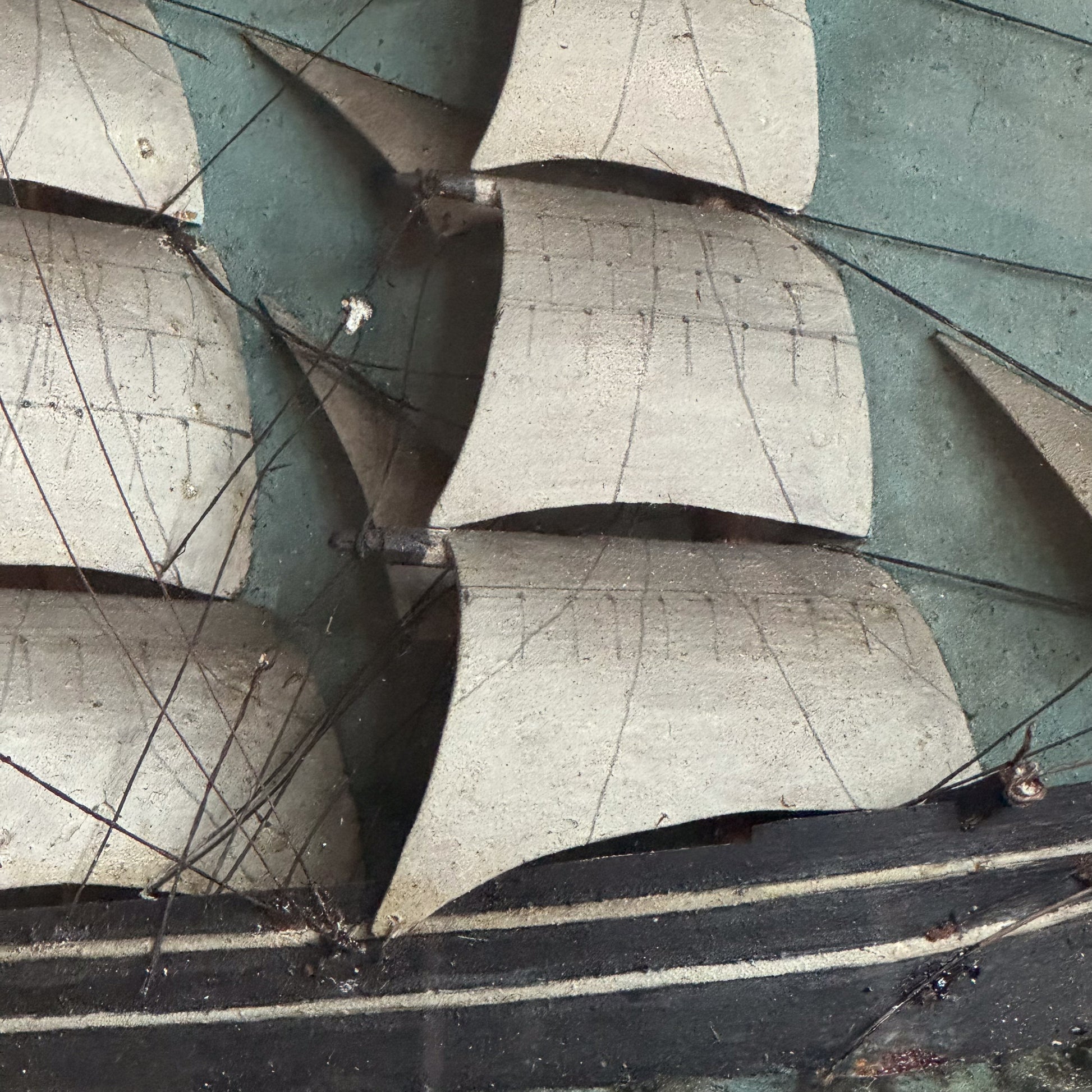 A folk art sailor-made diorama of a three masted ship. Presented within its original shadowbox frame.
