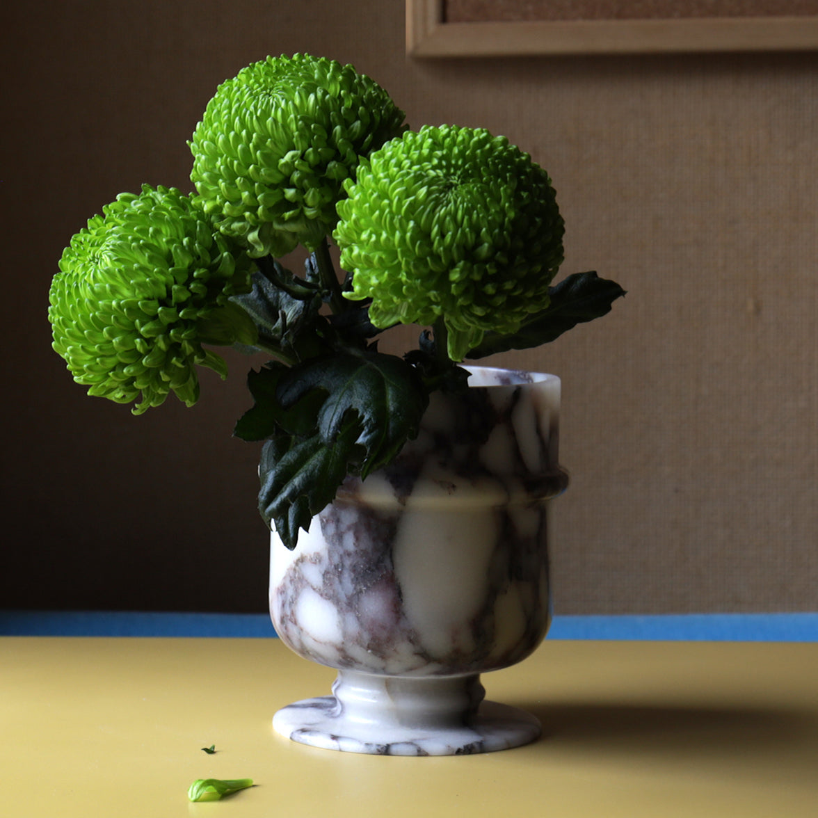 This Calacatta Viola marble cup designed by Bridie Hall gives a classic, chalice-like silhouette with a rounded bowl and a solid, flared foot.
