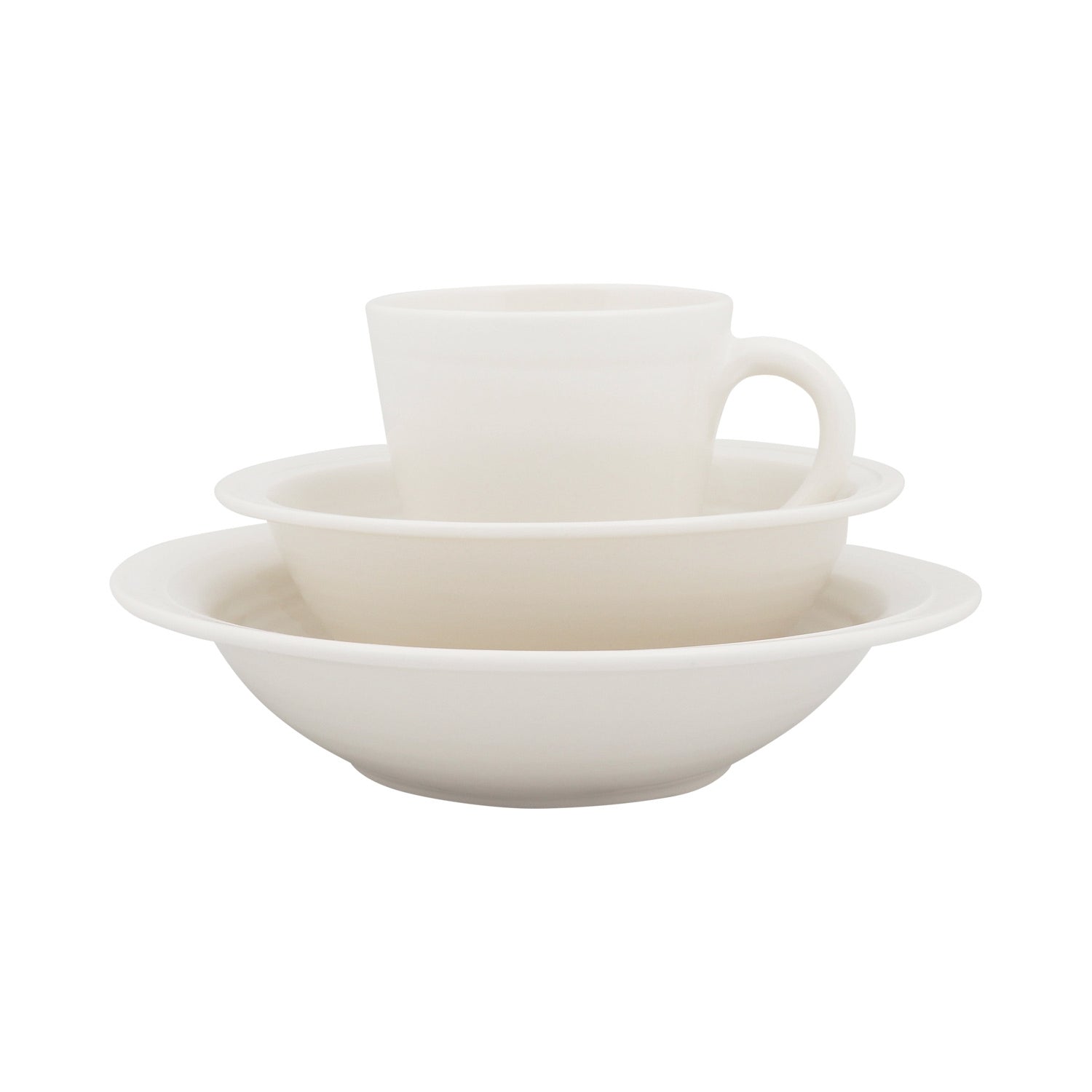 The white creamware dishes are light and simple but sturdy, with a transparent finish. The mould for each shape was hand thrown by Frances to coordinate with her full collection. The dishes are designed for everyday use, and each piece is dishwasher- and microwave-safe. The creamware is of superlative quality and durability.