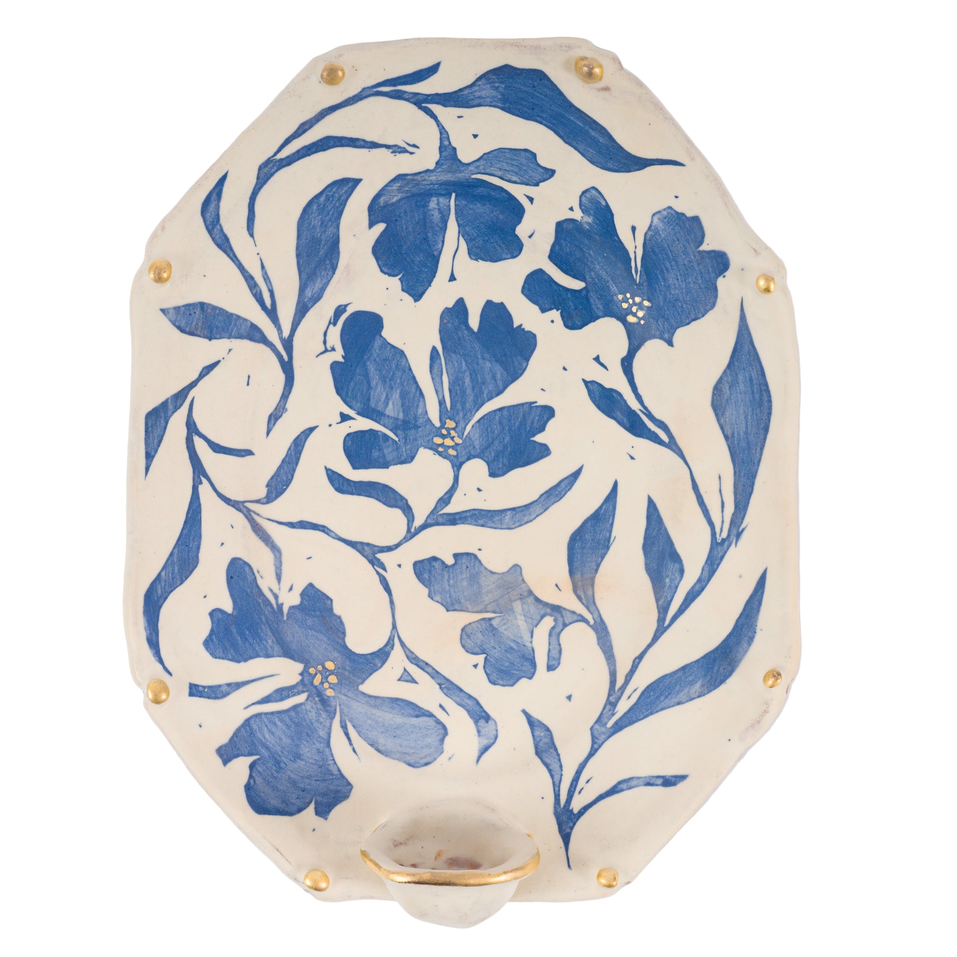 Terracotta intricately decorated in blue glaze, 9ct gold lustreware and slip.