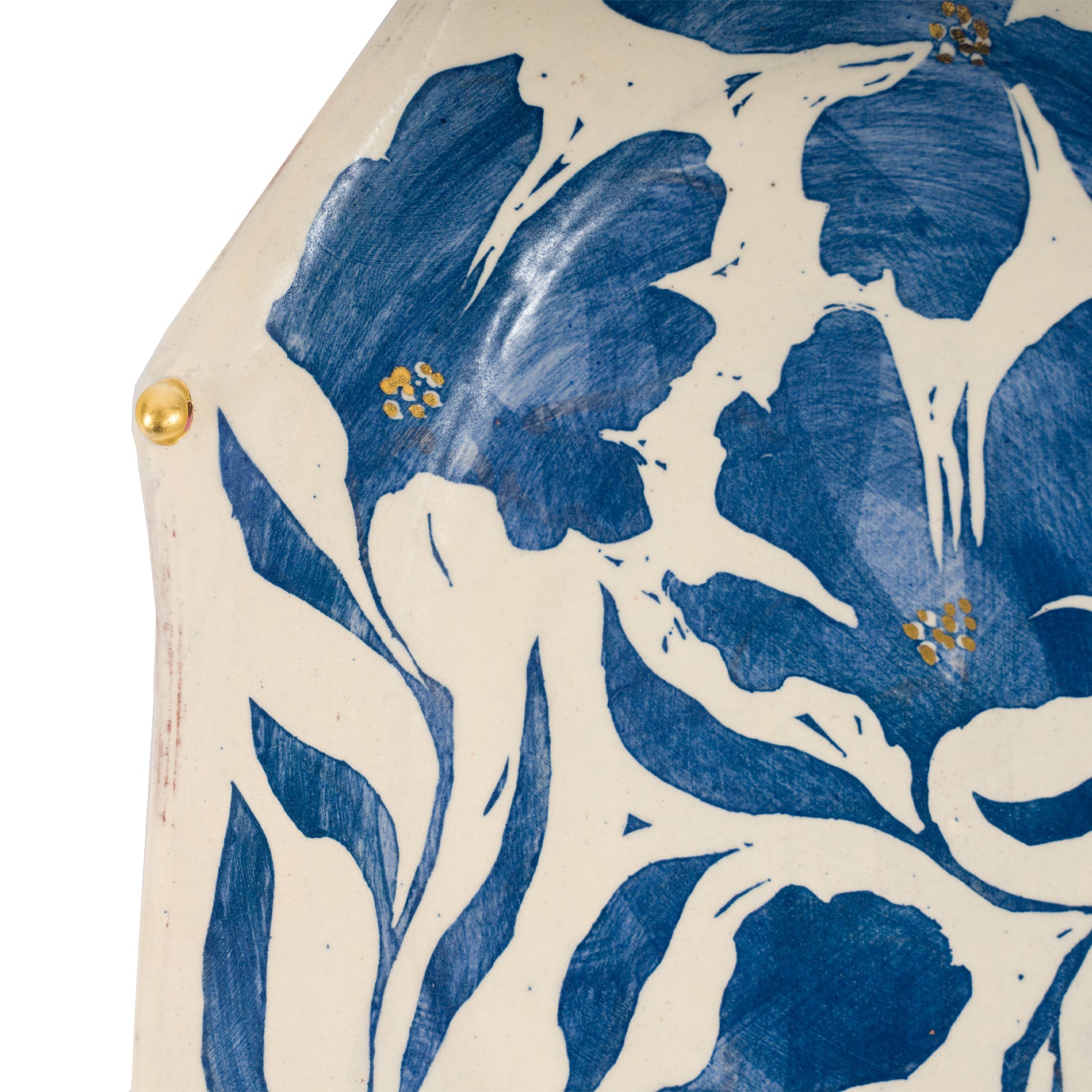 Terracotta intricately decorated in blue glaze, 9ct gold lustreware and slip.