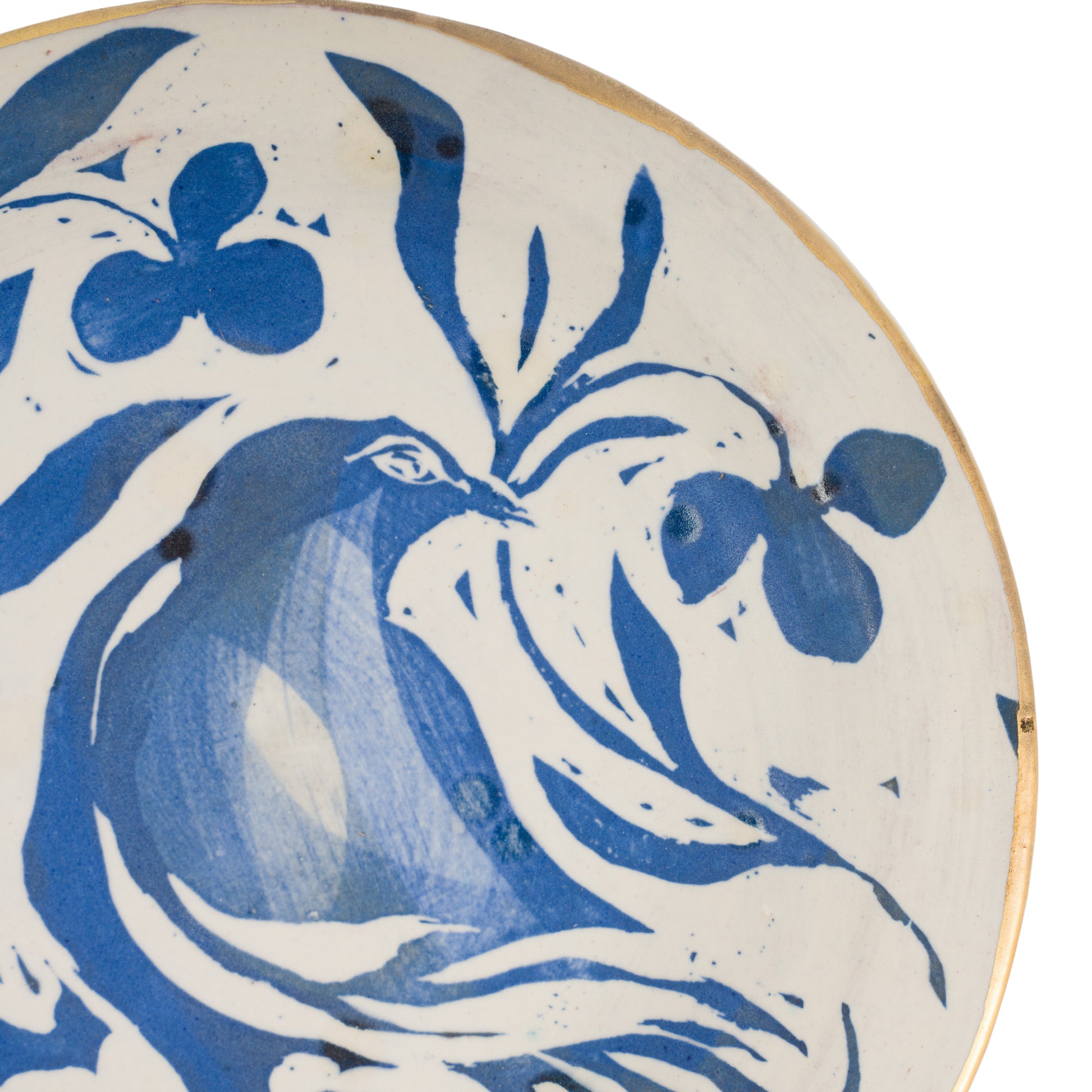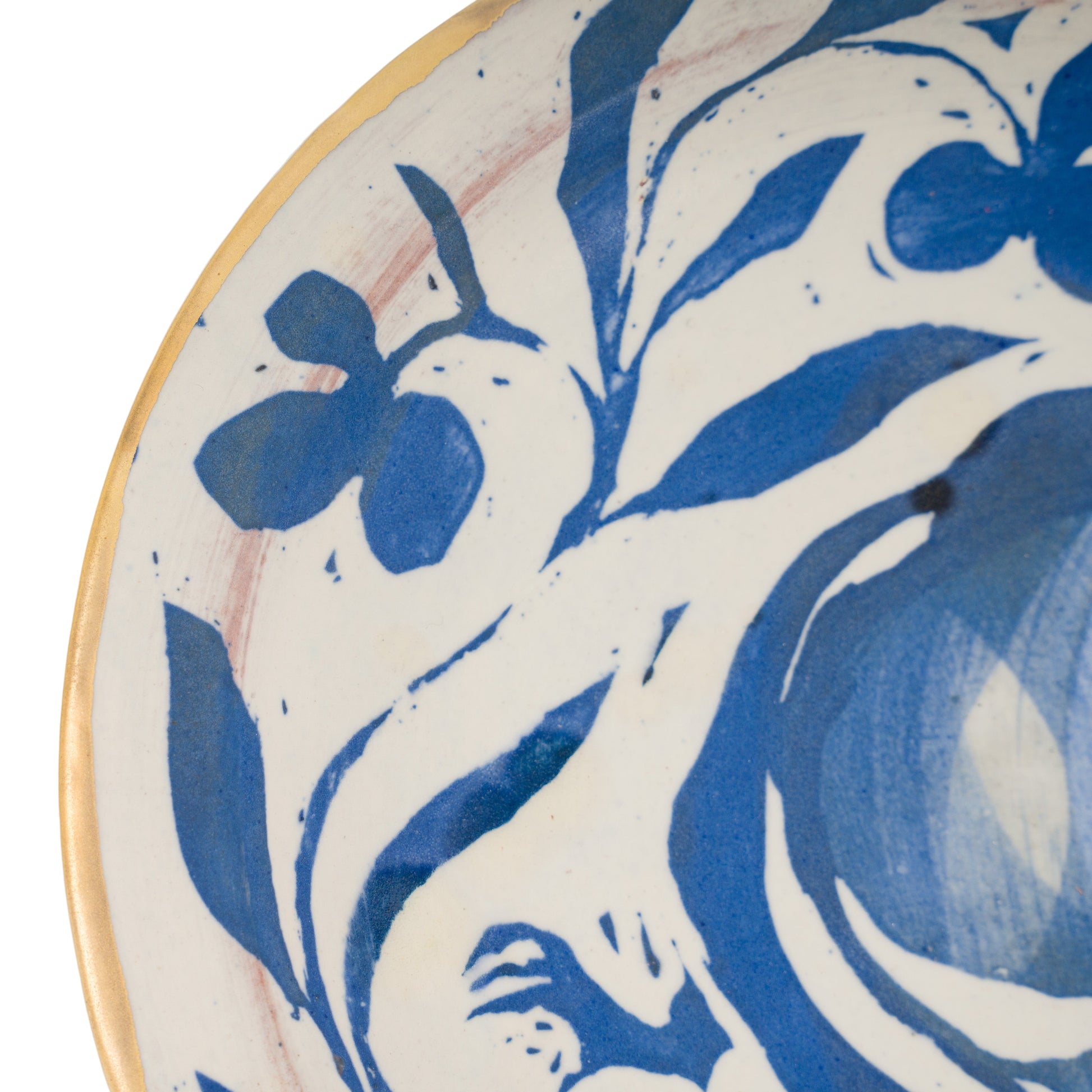 Terracotta intricately decorated in blue glaze, 9ct gold lustreware and slip.