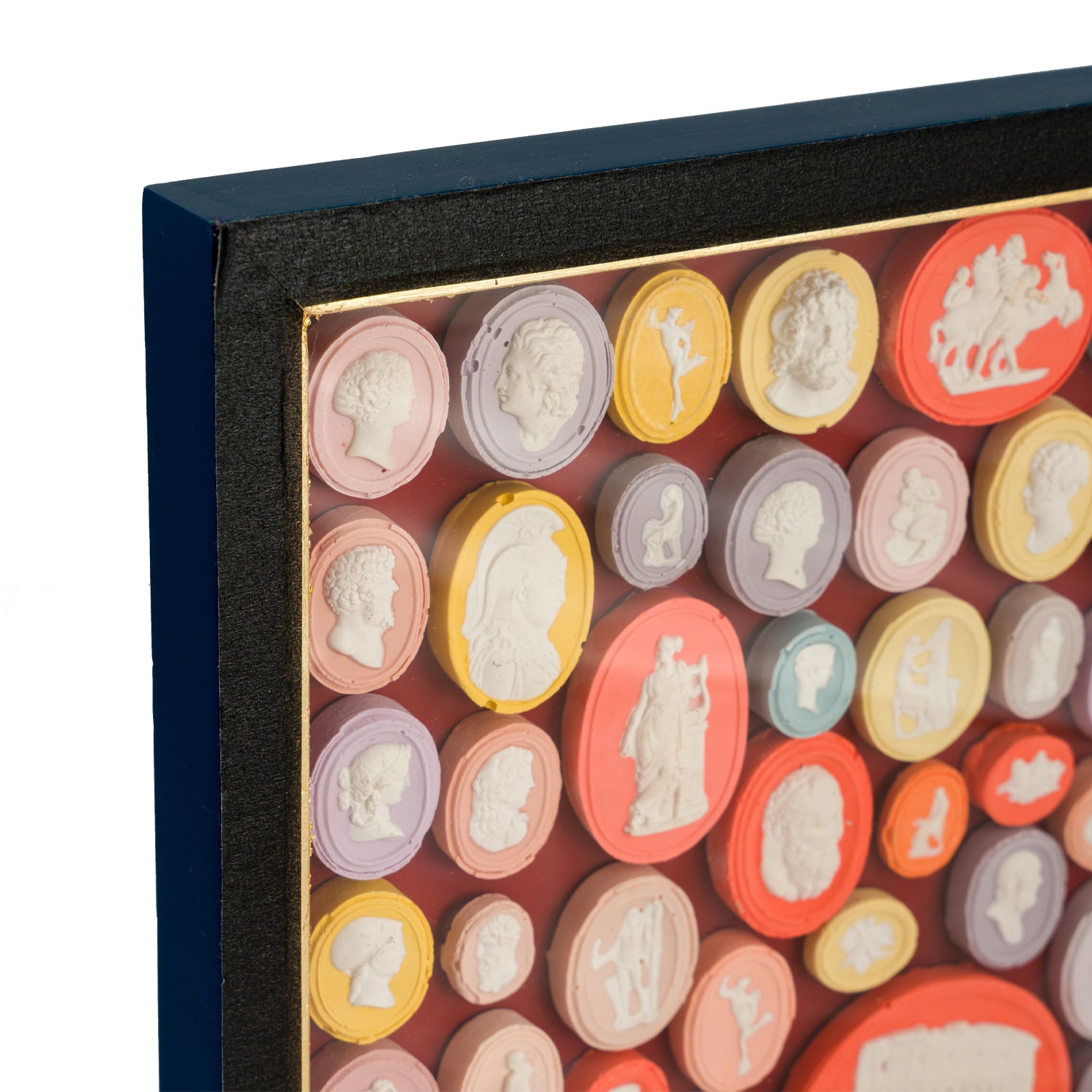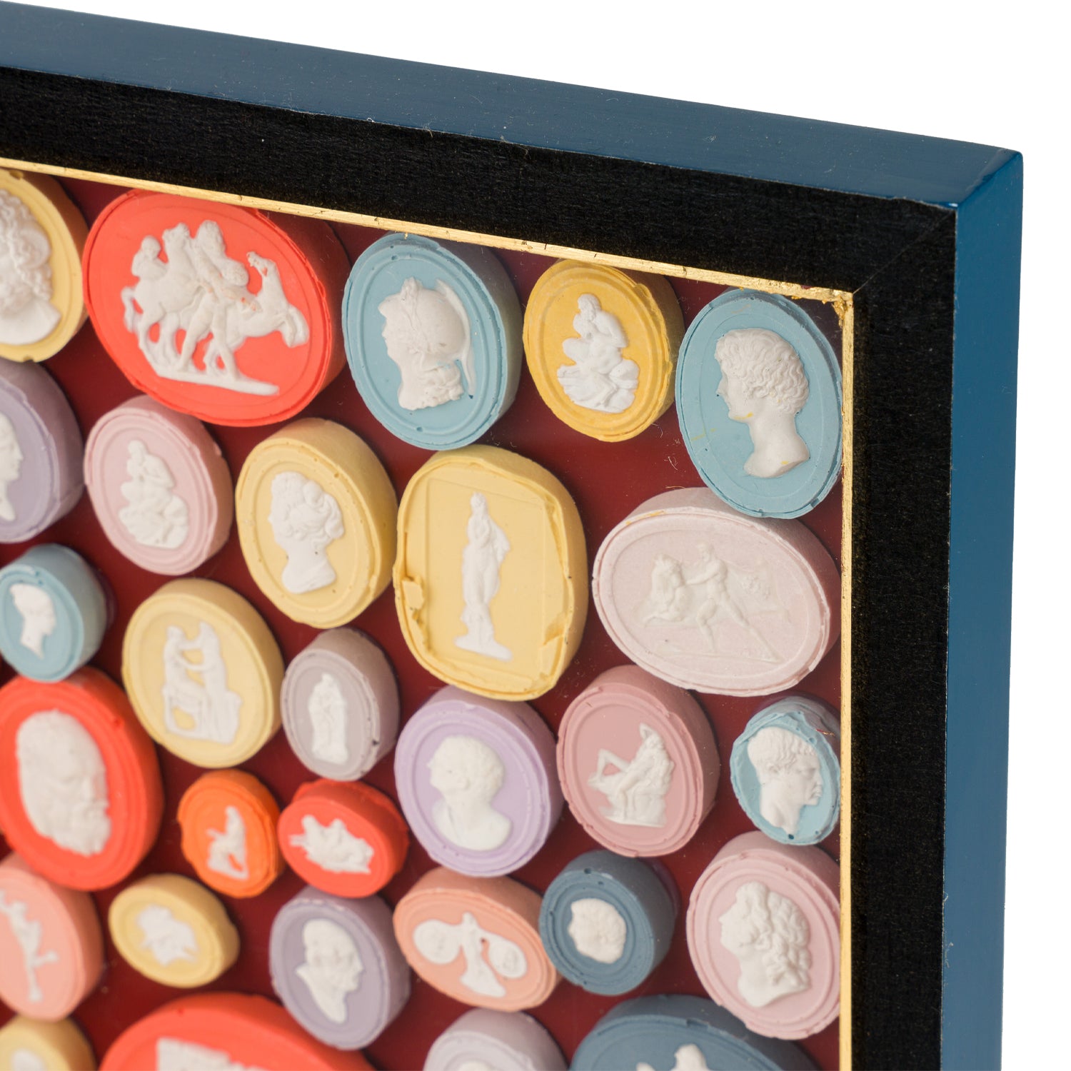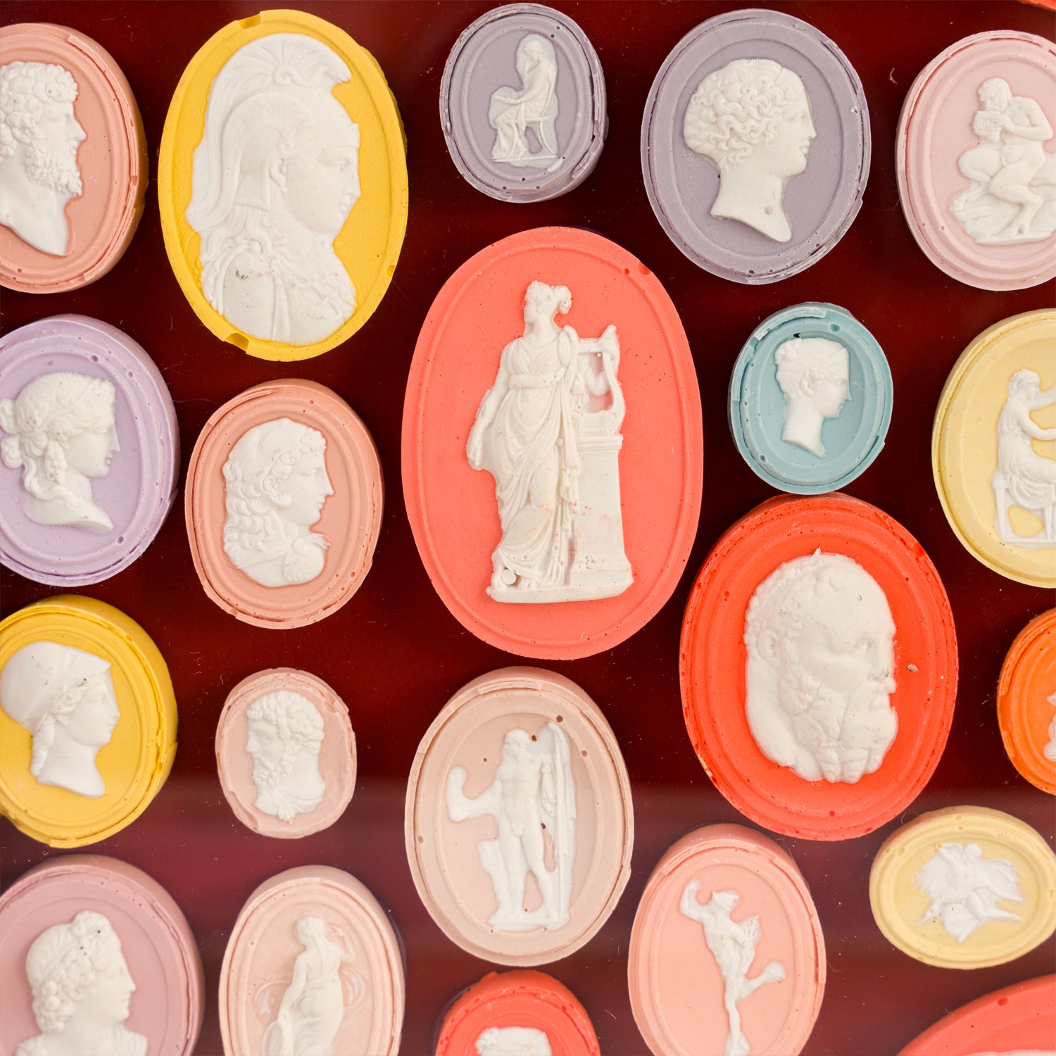 Inspired by the famous Cobbe museum’s collections of colourful ‘medallion wafers’. When hardstone cameos and intaglios produced during the Italian Renaissance period, were so rare and expensive they were reserved for only the richest collectors. The more modest ‘grand tourers’ sought out reproductions in glass and plaster or red or white sulphur during the C18th and C19th.