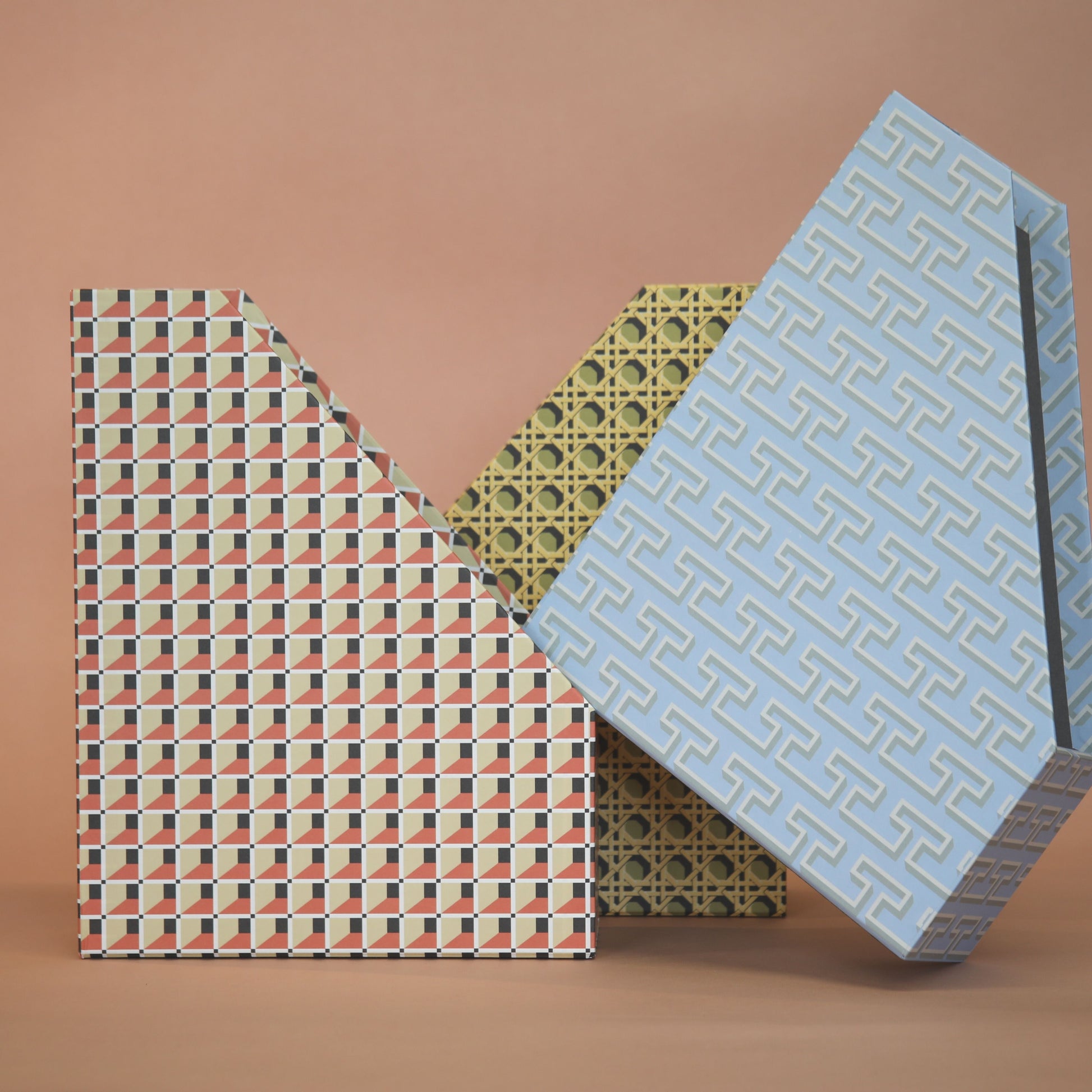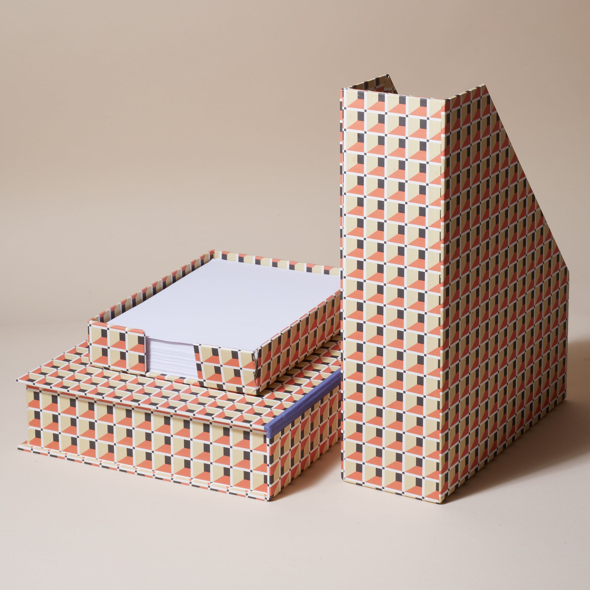 Inspired by the Opus Sectile (a practice dating back to antiquity) marble floors of St Mark’s Basilica in Venice, Bridie drew variations of her own to create our new range of patterns. Covered in the decorative paper, these magazine files bring a dash of erring-do to the most disorganised desk.