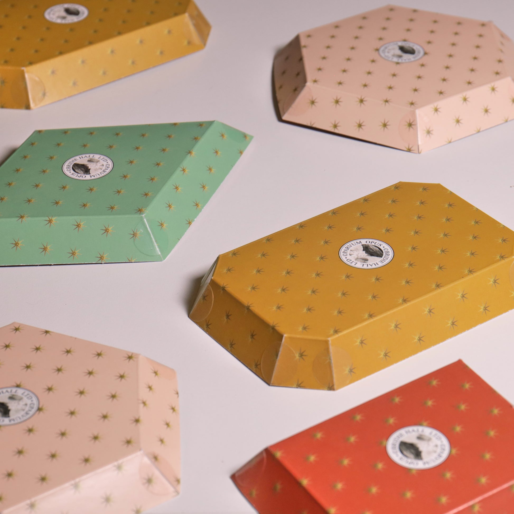 Each tray is printed internally with an 18th century illustration of sea shells from Regenfuss' "Choix de Coquillages et de Crustacés" and externally with Parvum Opus 'Giotto Star' motif in differing colours.