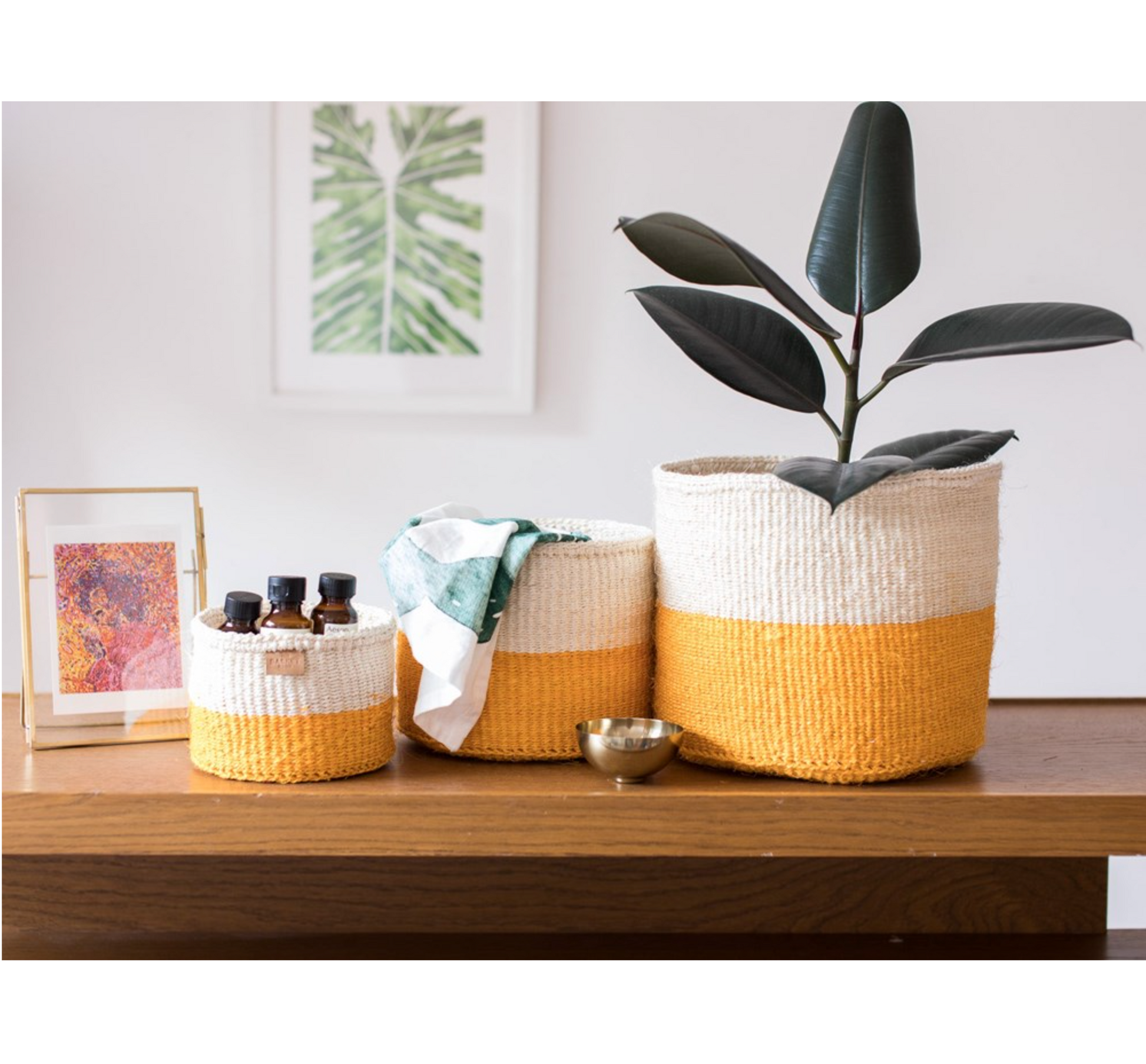 These coloured baskets are produced by a small Kenyan weaving cooperative of around forty members, with a dedicated dye manager who oversees colour quality and consistency. Sisal grass is sourced ready-rolled when orders come in from The Basket Room, hand-dyed in large vats of boiling water and hung out to dry before the weaving starts.