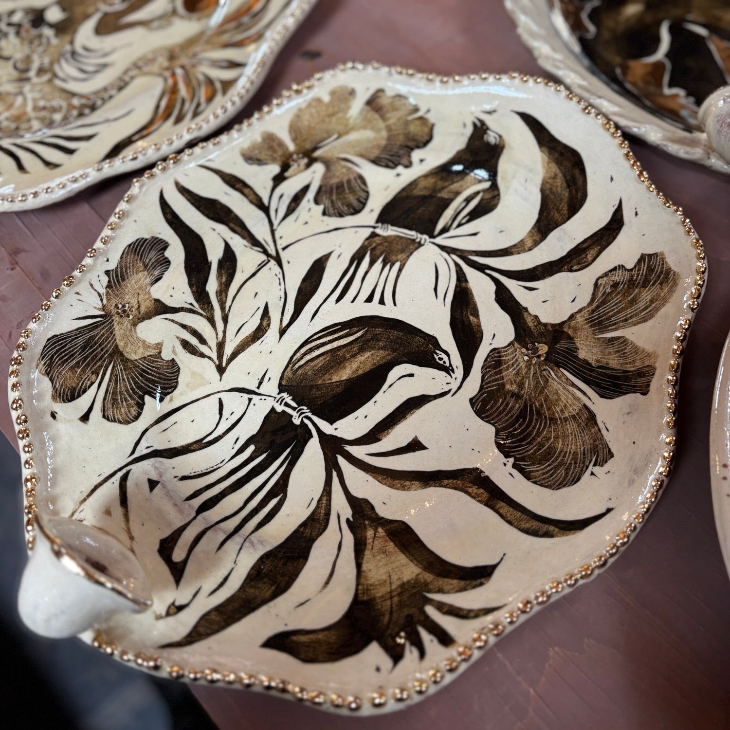 Terracotta intricately decorated in blue glaze, 9ct gold lustreware and slip.